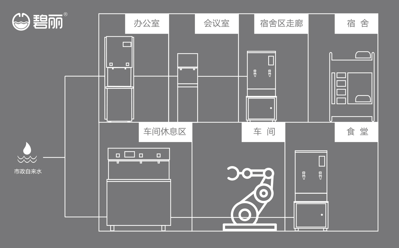 不同的飲水點可根據(jù)實際使用情況,安裝管線機或飲水設(shè)備或開水器,使用戶能喝上開水、溫開水、純凈水等,來滿足不同場景的飲水需求;