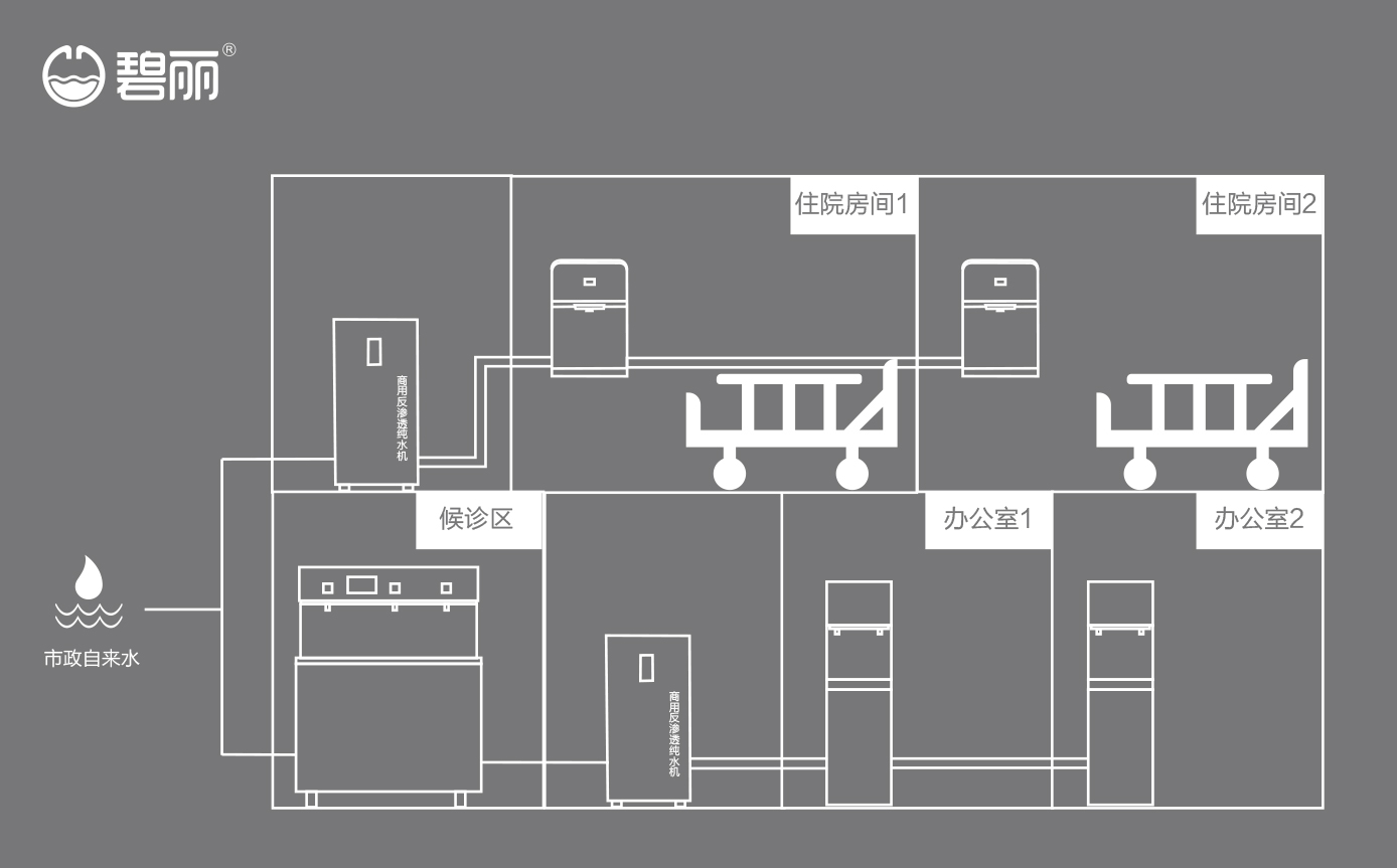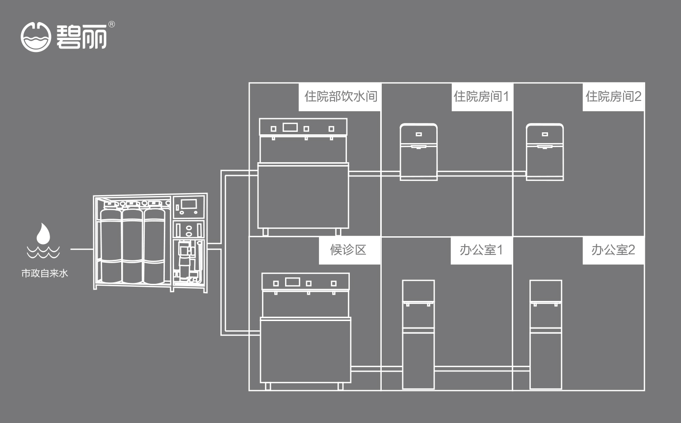 碧麗商用反滲透純水機(jī)將自來水集中處理后,把優(yōu)質(zhì)的純凈水通過專用的供水管道輸送到各飲水點(diǎn);